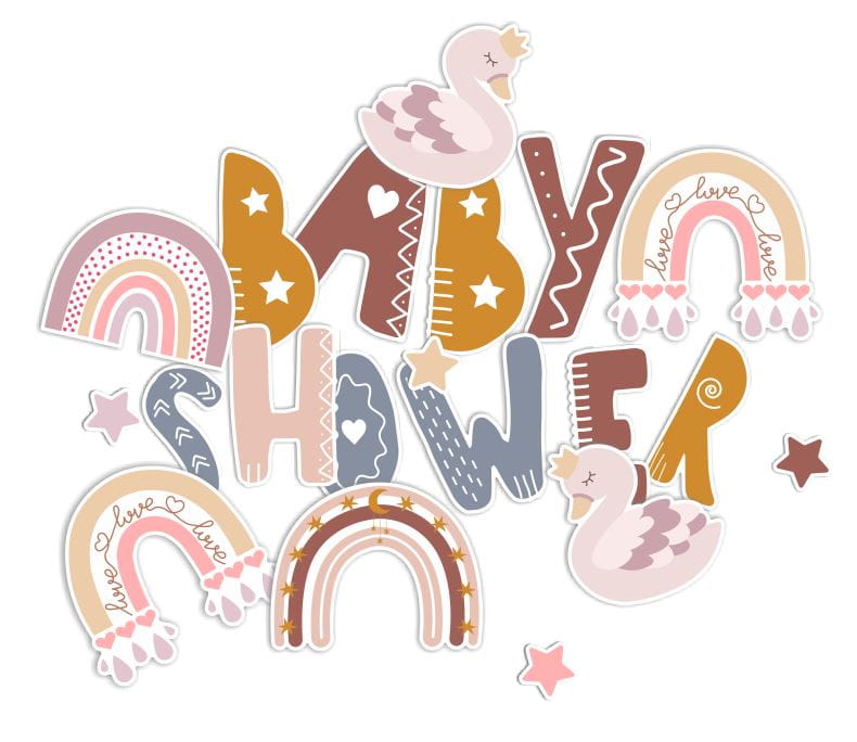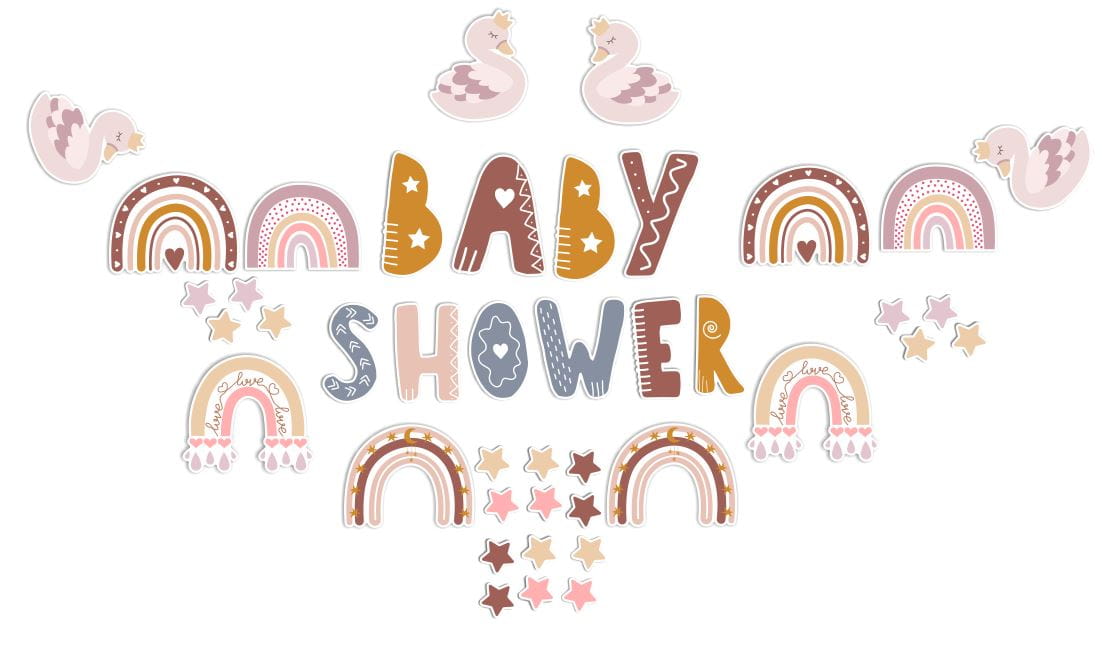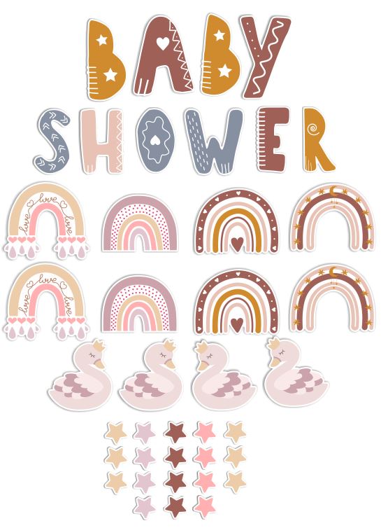 W zestawie znajdują się: litery tworzące napis "BABY SHOWER", 4 łabędzie, tęcze w stylu boho oraz małe kolorowe gwiazdki.