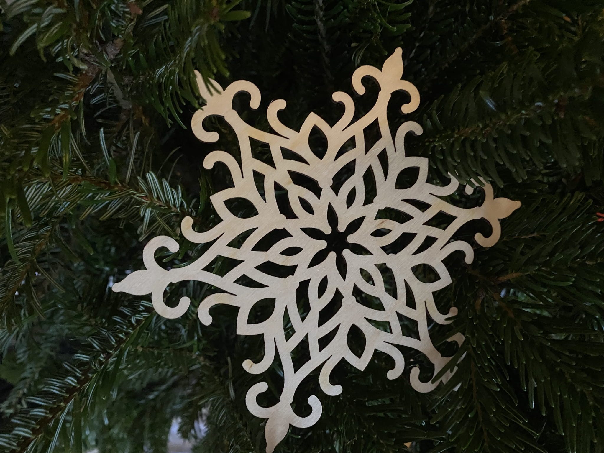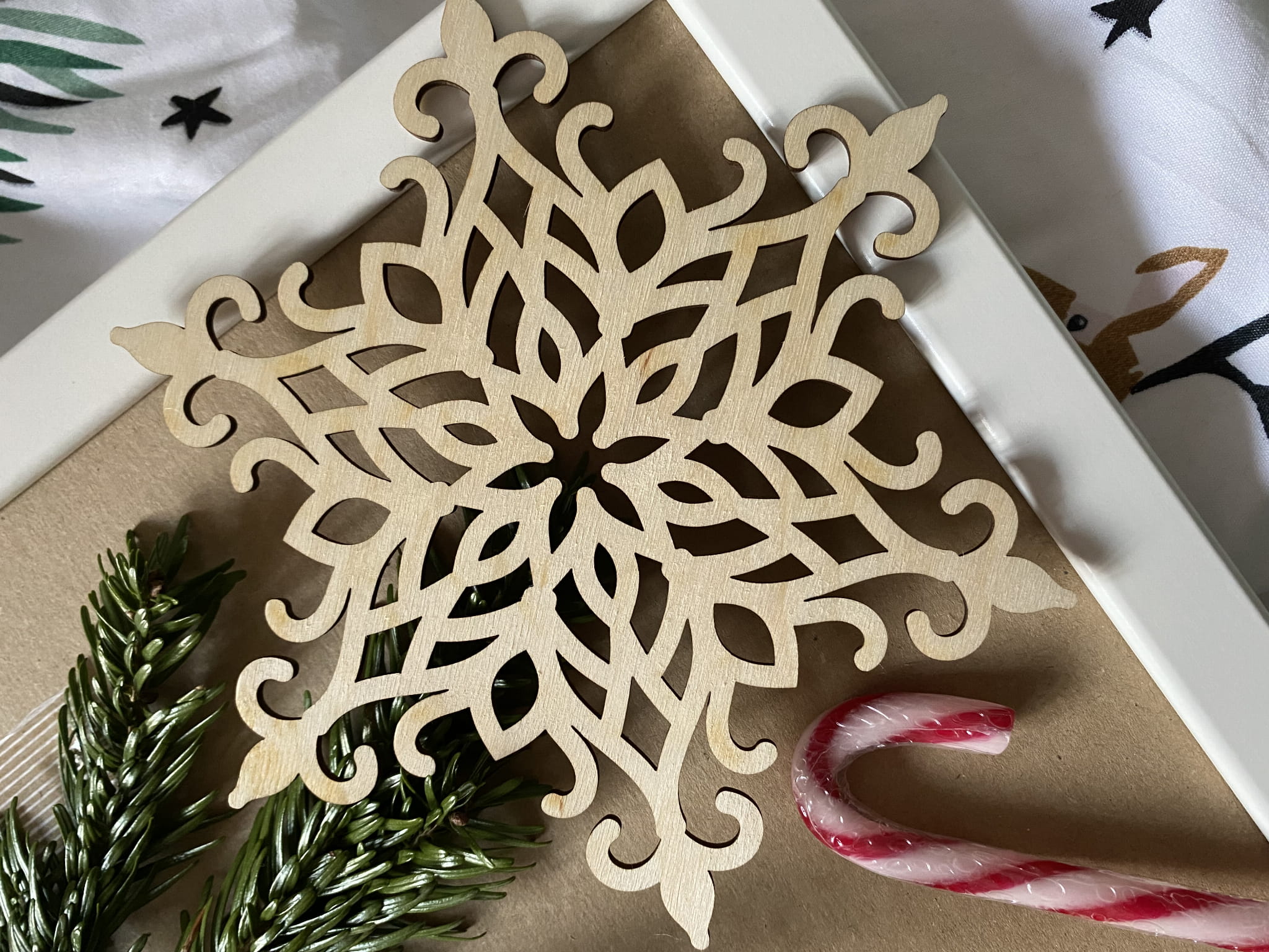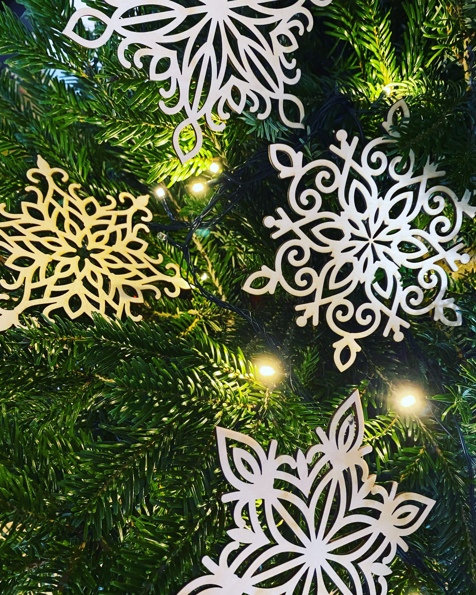 Zestaw czterech śnieżynek, wykonany ze sklejki brzozowej. Wyprodukowany przez ZRB Intergo.