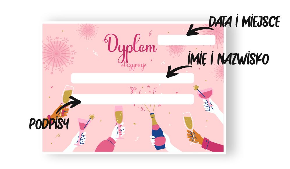 Nasze dyplomy drukujemy w wersji do wypełnienia ręcznego - w wykropkowanych polach można wpisać miejscowość, datę oraz imię i nazwisko nagrodzonej osoby. Aby zamówić dyplomy w takiej wersji wystarczy po prostu dodać dany dyplom do koszyka.