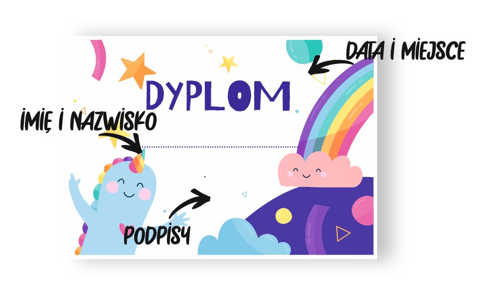 Nasze dyplomy drukujemy w wersji do wypełnienia ręcznego - w wykropkowanych polach można wpisać miejscowość, datę oraz imię i nazwisko nagrodzonej osoby. Aby zamówić dyplomy w takiej wersji wystarczy po prostu dodać dany dyplom do koszyka.