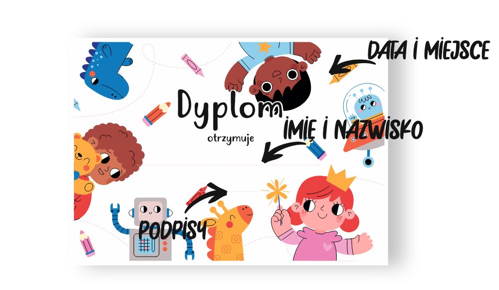 Nasze dyplomy drukujemy w wersji do wypełnienia ręcznego - w wykropkowanych polach można wpisać miejscowość, datę oraz imię i nazwisko nagrodzonej osoby. Aby zamówić dyplomy w takiej wersji wystarczy po prostu dodać dany dyplom do koszyka.