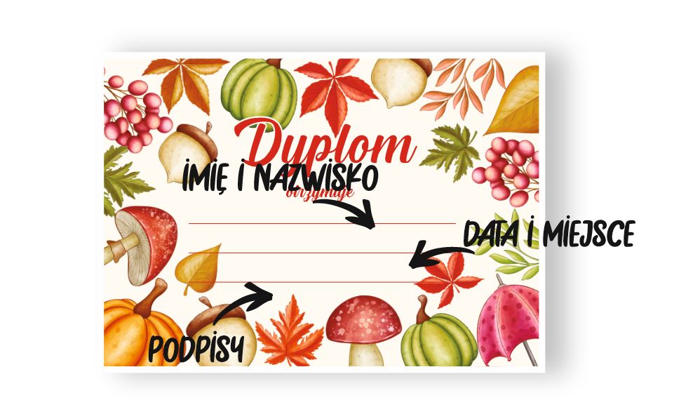 Dyplom wykonany przez ZRB Intergo, będzie idealnym prezentem do wręczenia dziecku w zabawie jesiennej lub konkursie.