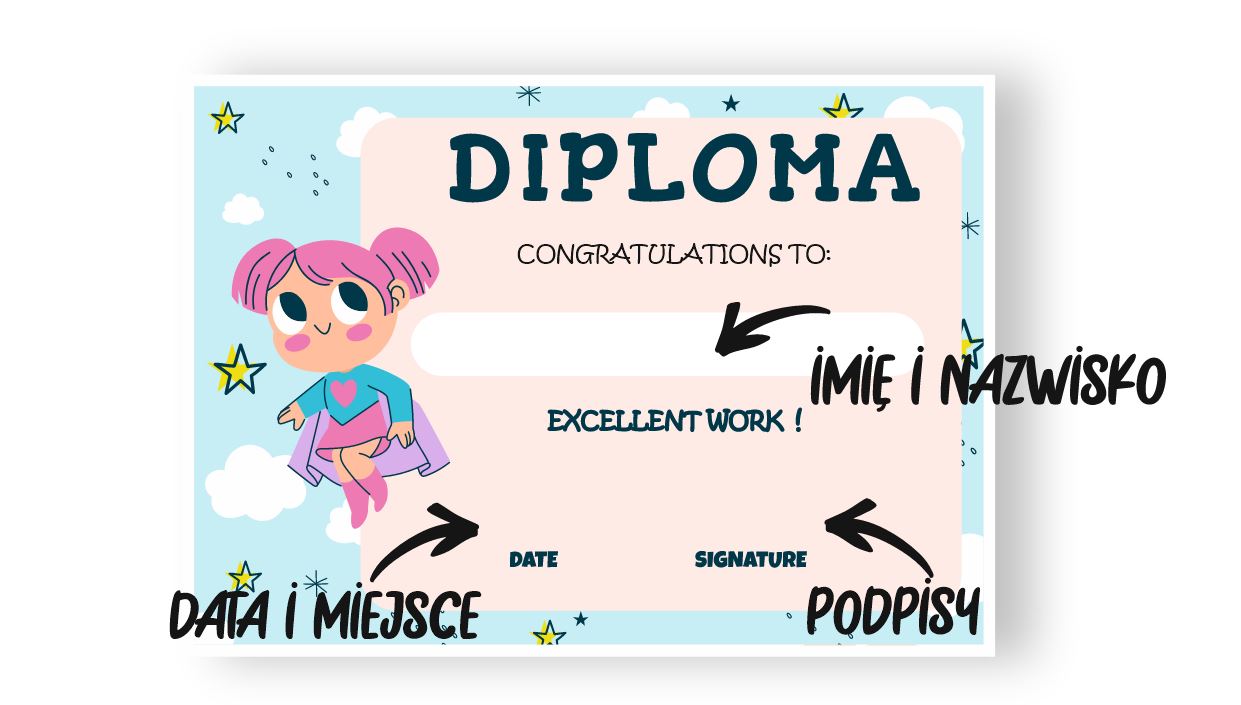 Nasze dyplomy drukujemy w wersji do wypełnienia ręcznego - w wykropkowanych polach można wpisać miejscowość, datę oraz imię i nazwisko nagrodzonej osoby. Aby zamówić dyplomy w takiej wersji wystarczy po prostu dodać dany dyplom do koszyka.