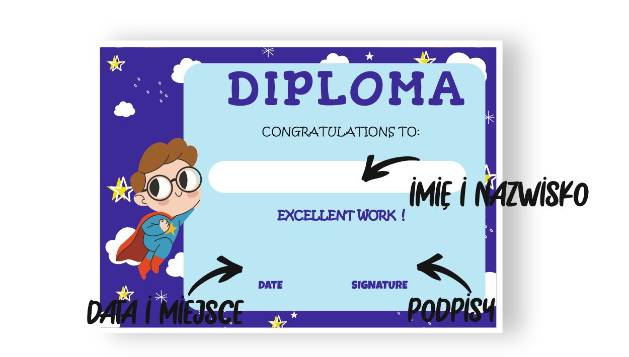Nasze dyplomy drukujemy w wersji do wypełnienia ręcznego - w wykropkowanych polach można wpisać miejscowość, datę oraz imię i nazwisko nagrodzonej osoby. Aby zamówić dyplomy w takiej wersji wystarczy po prostu dodać dany dyplom do koszyka.