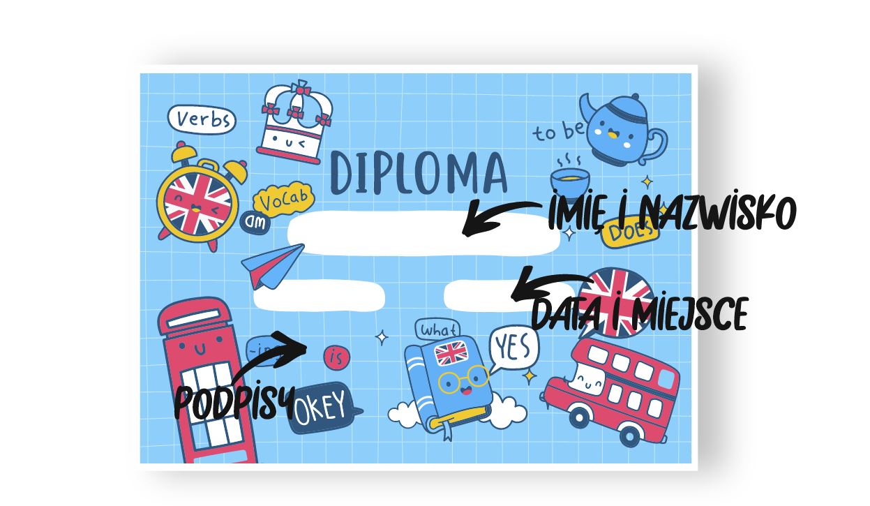 Nasze dyplomy drukujemy w wersji do wypełnienia ręcznego - w wykropkowanych polach można wpisać miejscowość, datę oraz imię i nazwisko nagrodzonej osoby. Aby zamówić dyplomy w takiej wersji wystarczy po prostu dodać dany dyplom do koszyka.