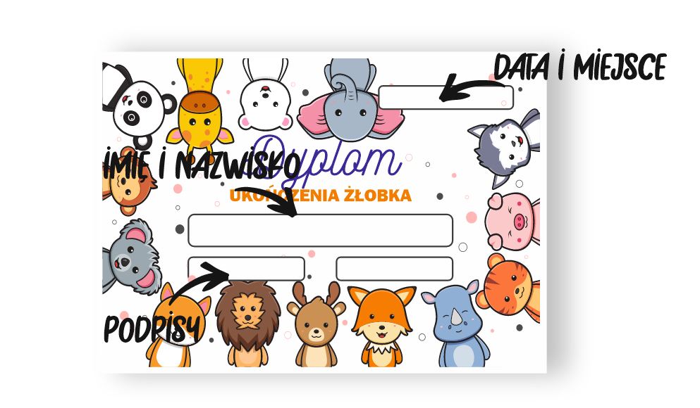 Nasze dyplomy drukujemy w wersji do wypełnienia ręcznego - w wykropkowanych polach można wpisać miejscowość, datę oraz imię i nazwisko nagrodzonej osoby. Aby zamówić dyplomy w takiej wersji wystarczy po prostu dodać dany dyplom do koszyka.
