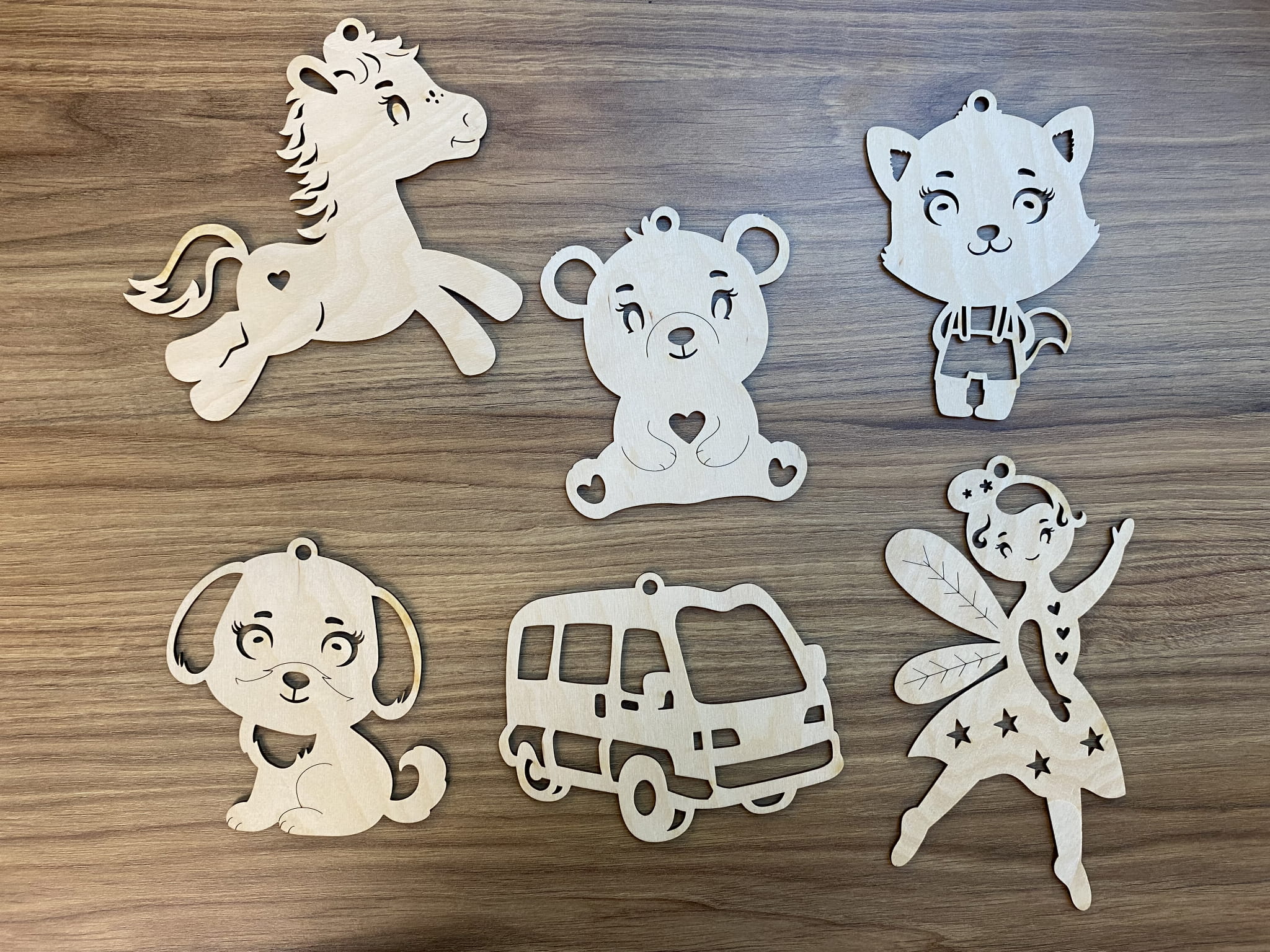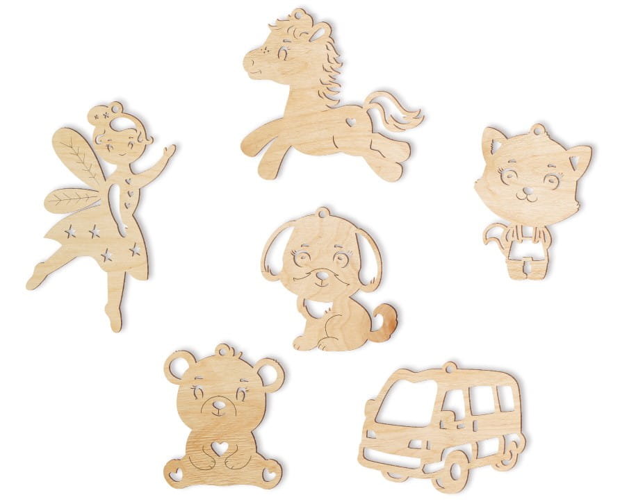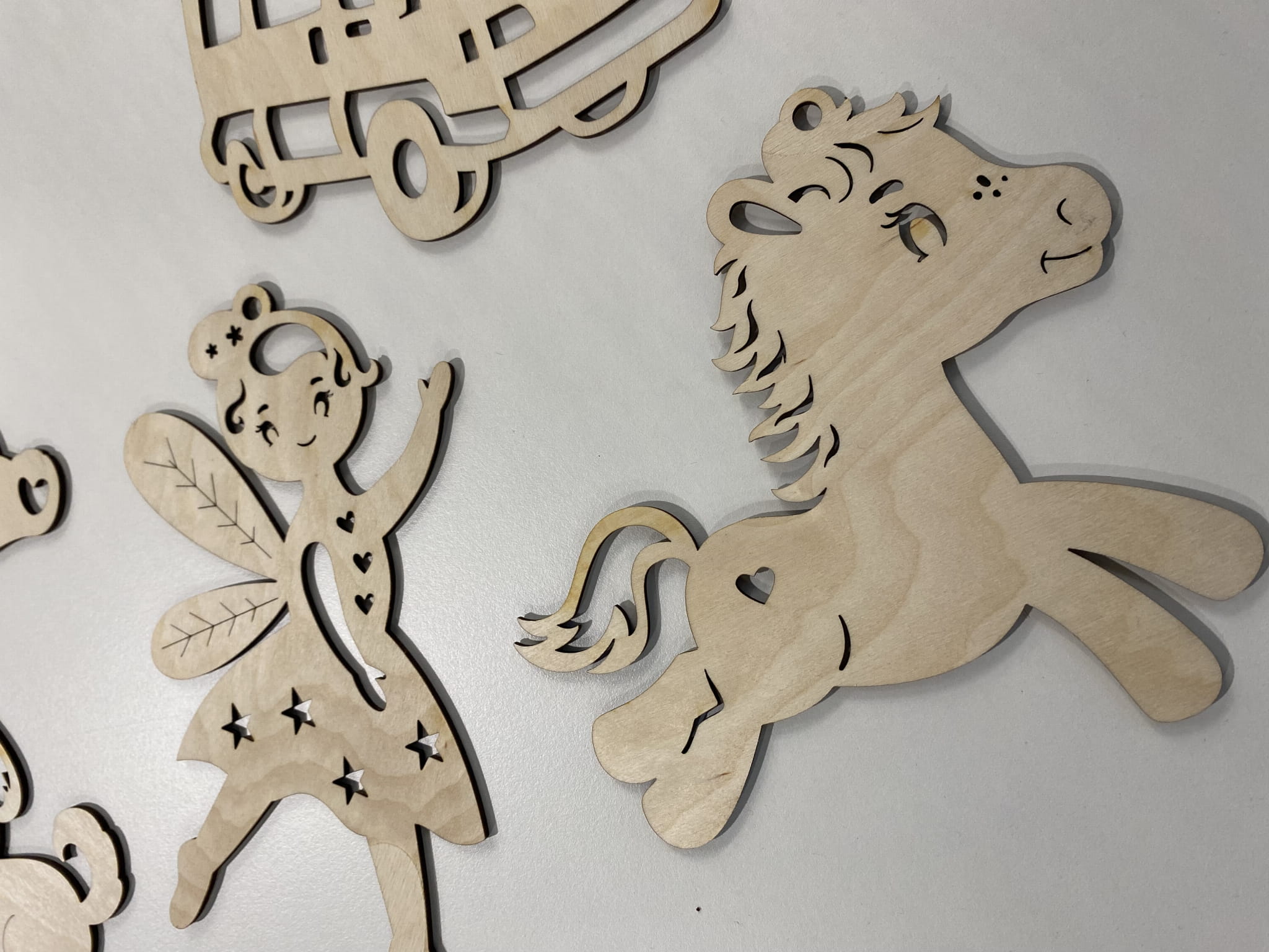 Kreatywna girlanda drewniana, w której znajduje się: miś, wróżka, autobus, kot, piesek i kucyk.