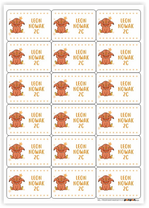 - UWAGA: Na jednym zamawianym arkuszu (z 18 naklejkami) robimy nadruk jednego imienia/nazwiska/klasy tj. na pojedynczym arkuszu nie umieszczamy różnych danych.