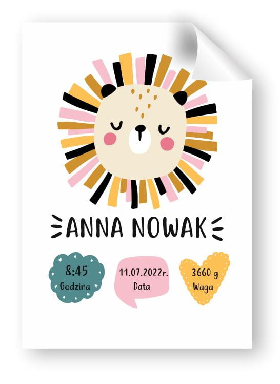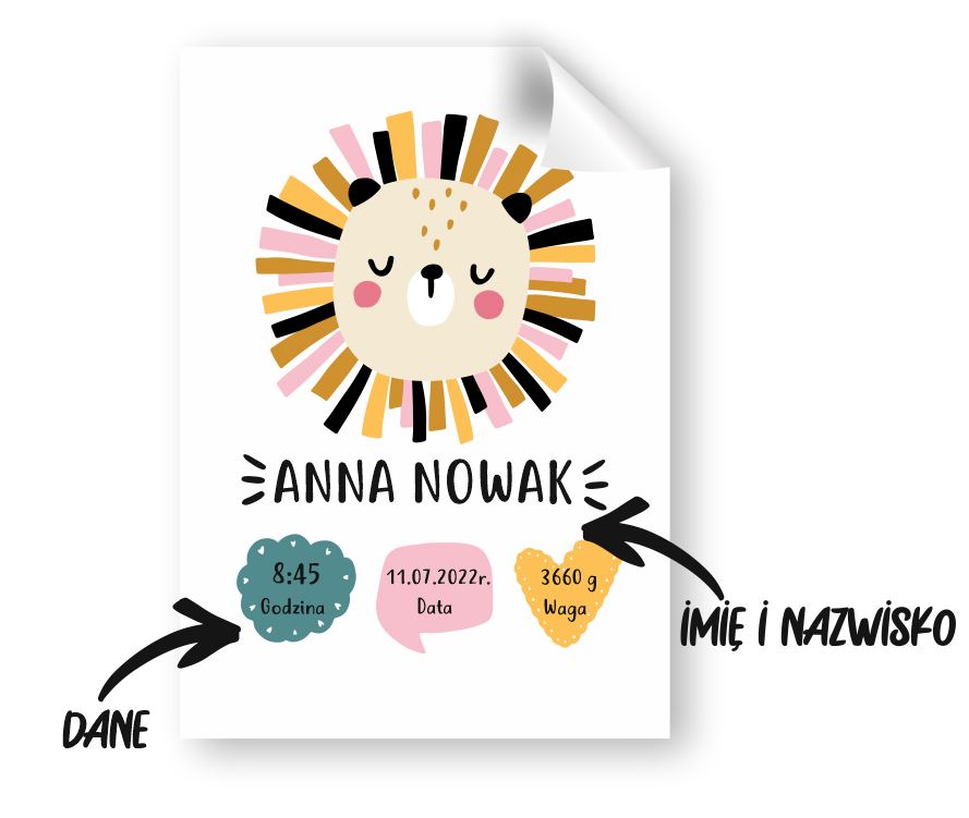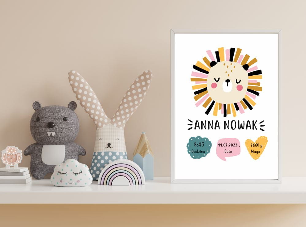 Personalizowana pamiątka zawierająca imię dziecka, datę i godzinę urodzenia oraz wagę po narodzinach. To doskonały prezent z okazji narodzin dziecka lub chrztu. Ilustracja nie tylko będzie pamiątką dla całej rodziny, ale także piękną ozdobą w pokoju dziecka.