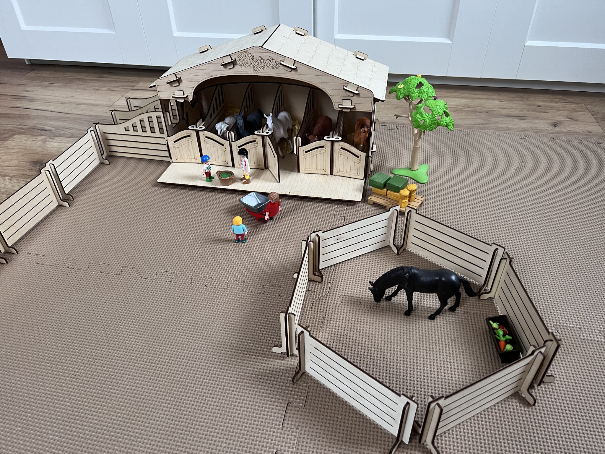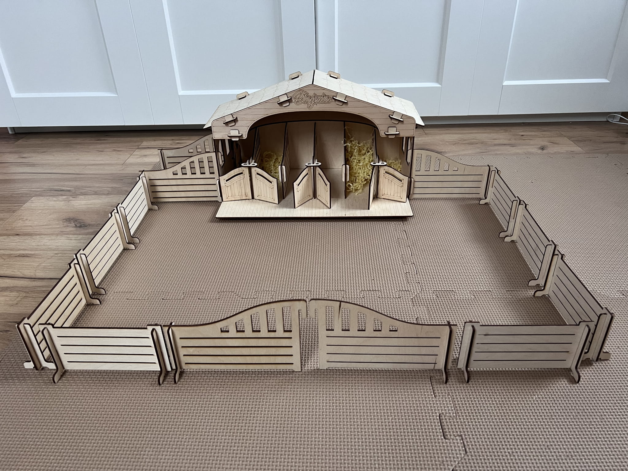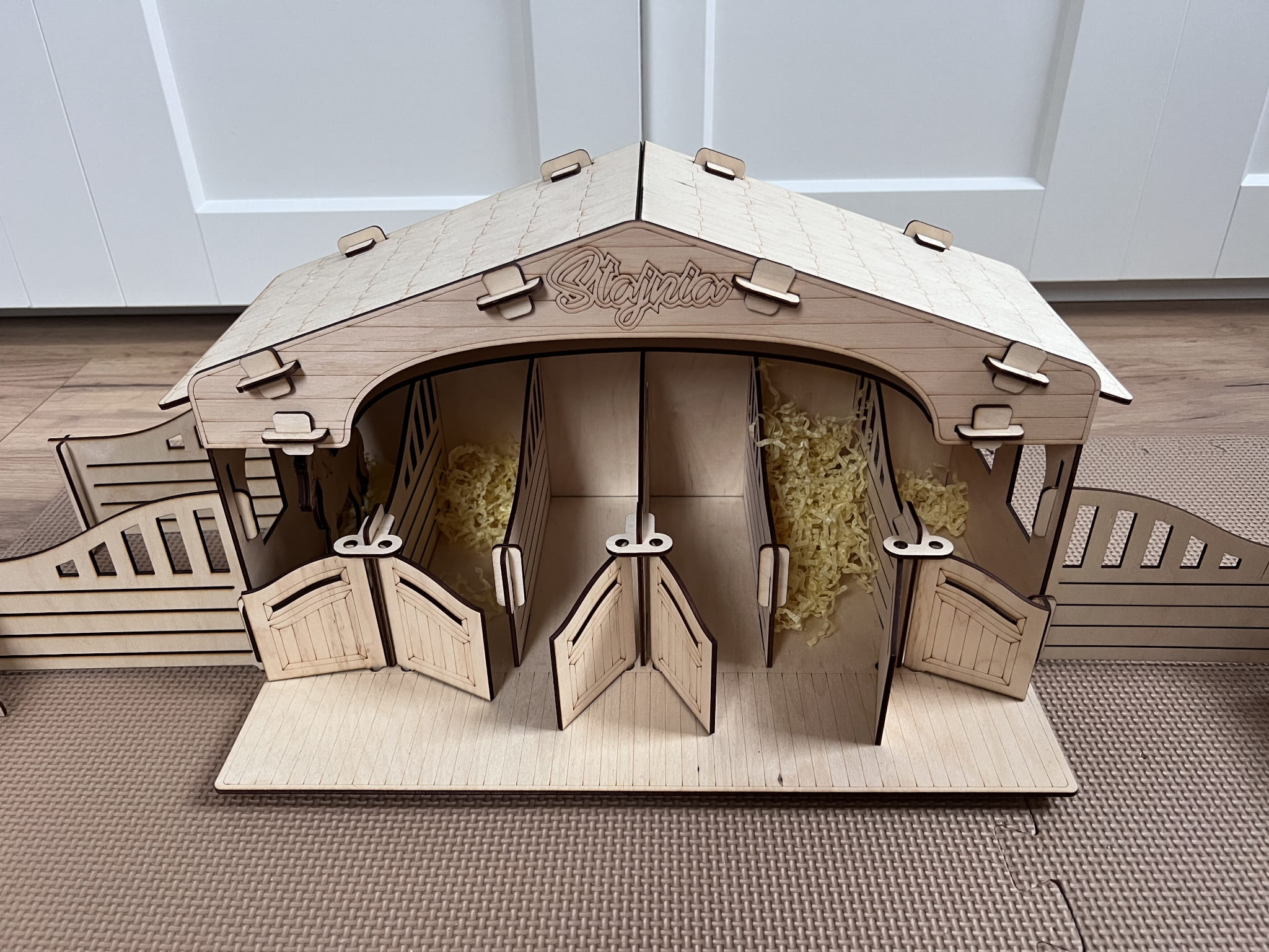 Stajnia wykonana jest ze sklejki brzozowej, która nadaje jej autentyczny charakter. Małe drzwi stajni otwierają się, aby ujawnić wnętrze, które jest przygotowane do zabawy. Wewnątrz stajni znajdują się drewniane boksy dla koni, gdzie dzieci mogą umieścić swoje ulubione figurki koni.