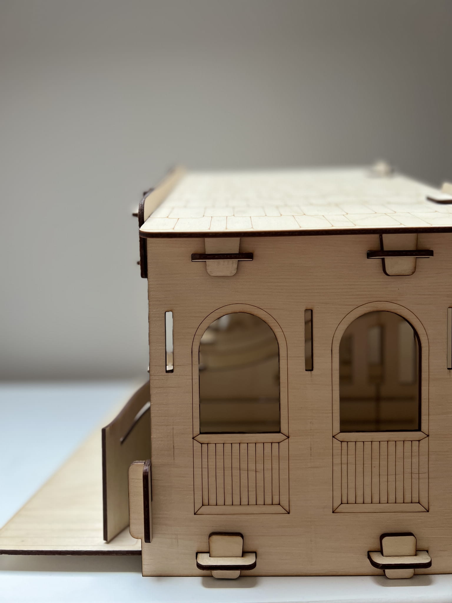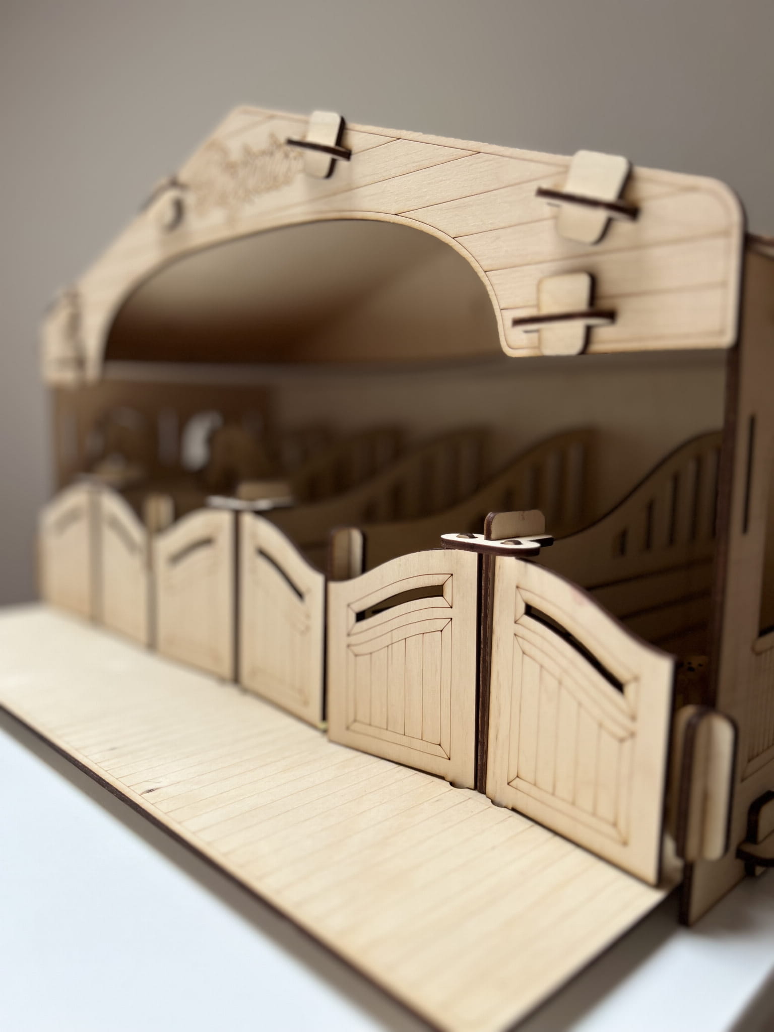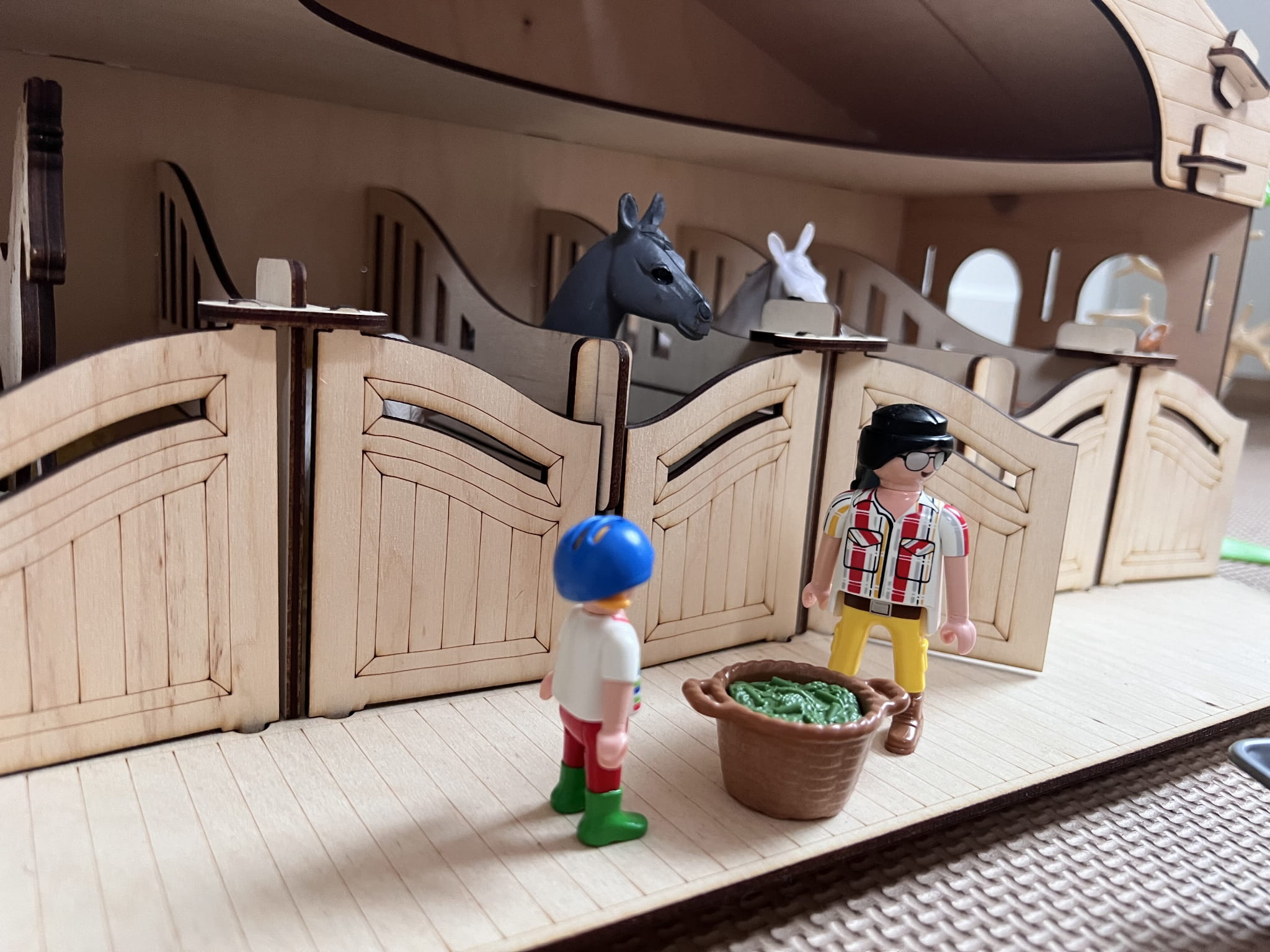 Stajnia wykonana jest ze sklejki brzozowej, która nadaje jej autentyczny charakter. Małe drzwi stajni otwierają się, aby ujawnić wnętrze, które jest przygotowane do zabawy. Wewnątrz stajni znajdują się drewniane boksy dla koni, gdzie dzieci mogą umieścić swoje ulubione figurki koni.