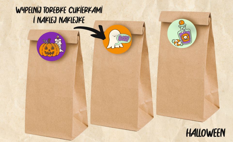Papierowe torebki z naklejkami Halloween idealnie sprawdzą się jako prezent dla gości, którzy przybyli na imprezę halloweenową. Do środka możesz zapakować różne słodkości oraz drobne upominki.