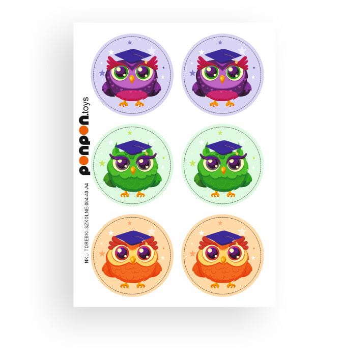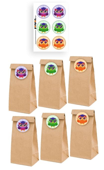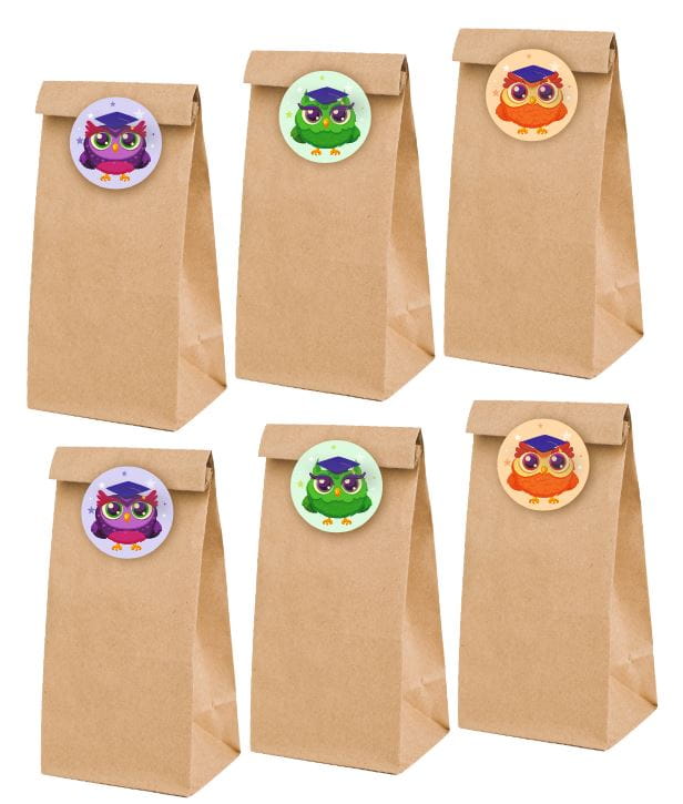 Torebki na słodycze + 6 naklejek - "Sowy w biretach"