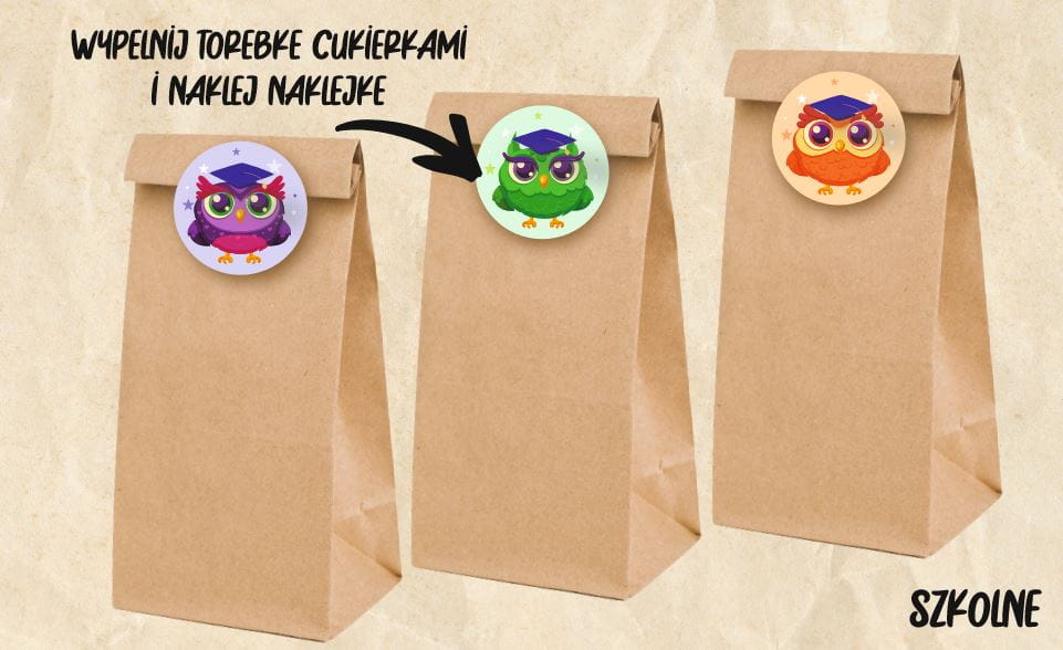Papierowe torebki z naklejkami idealnie sprawdzą się jako prezent dla uczniów, którzy przybyli na rozpoczęcie roku szkolnego lub zakończenie roku. Do środka możesz zapakować różne słodkości oraz drobne upominki.