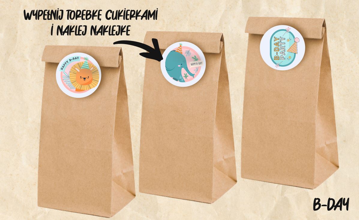 Papierowe torebki z naklejkami B-Day Party idealnie sprawdzą się jako prezent dla gości, którzy przybyli na imprezę. Do środka możesz zapakować różne słodkości oraz drobne upominki.